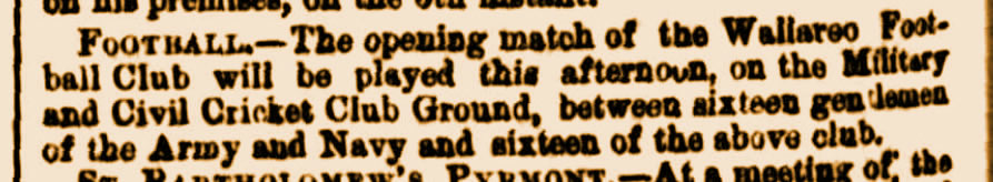 FOOTBALL. – The opening match of the Wallaroo Football Club will be played this afternoon, on the Military and Civil Cricket Club Ground, between sixteen gentlemen of the Army and Navy and sixteen of the above club.